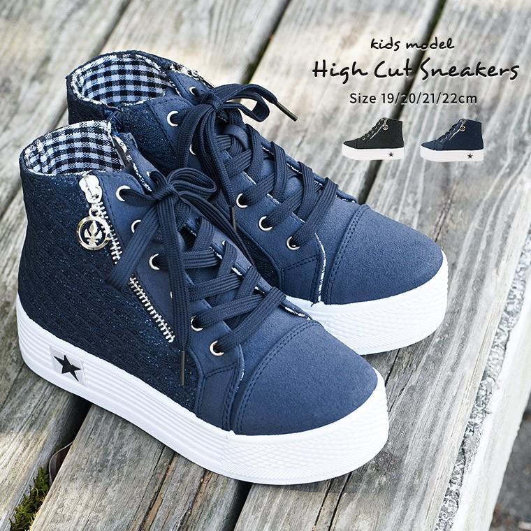 スニーカー キッズ ジュニア 女の子 ハイカット 厚底 靴 黒 ブラック