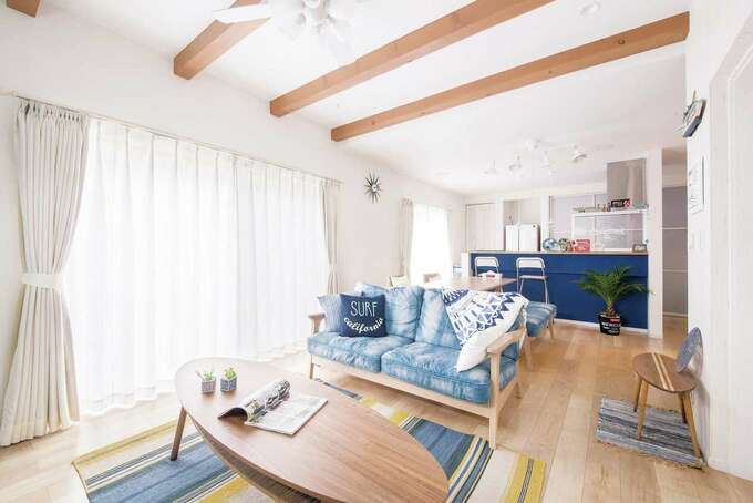 夫婦の 好き が集まるldk 白を基調とした空間に青のキッチンが映える 大小のインテリアも西海岸や海をイメージさせるものに統一し 毎日が大好