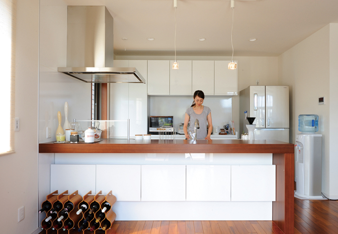 キッチン 壁に合わせて白で統一したデザイン性豊かなシステムキッチン 背面の食器棚はもちろん カウンターの下にも豊富な