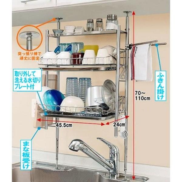 つっぱり棚 3段 幅45cm ロングサイズ ステンレス製 水切り棚 組立式