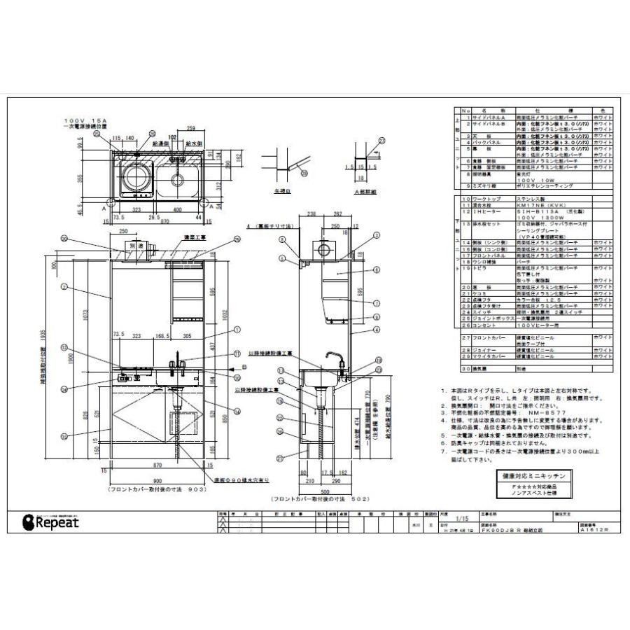 ミニキッチン間口900 奥行500 高さ1900 ihヒーター Fk90djb