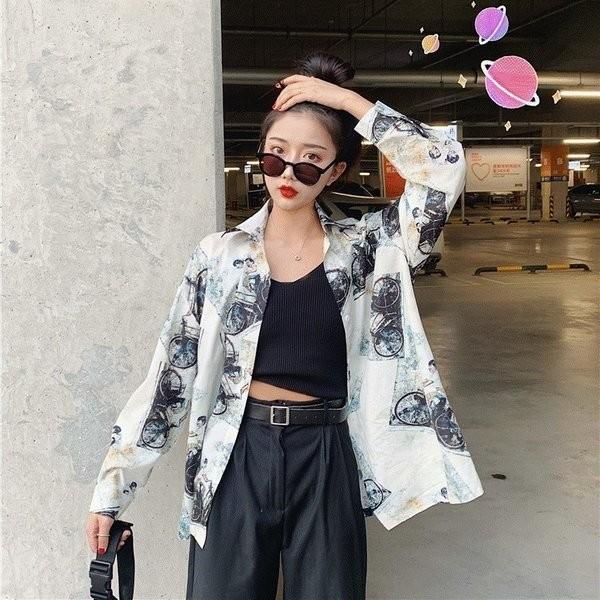 柄シャツ レトロ 長袖シャツ ブラウス 自転車柄 総柄 レディース